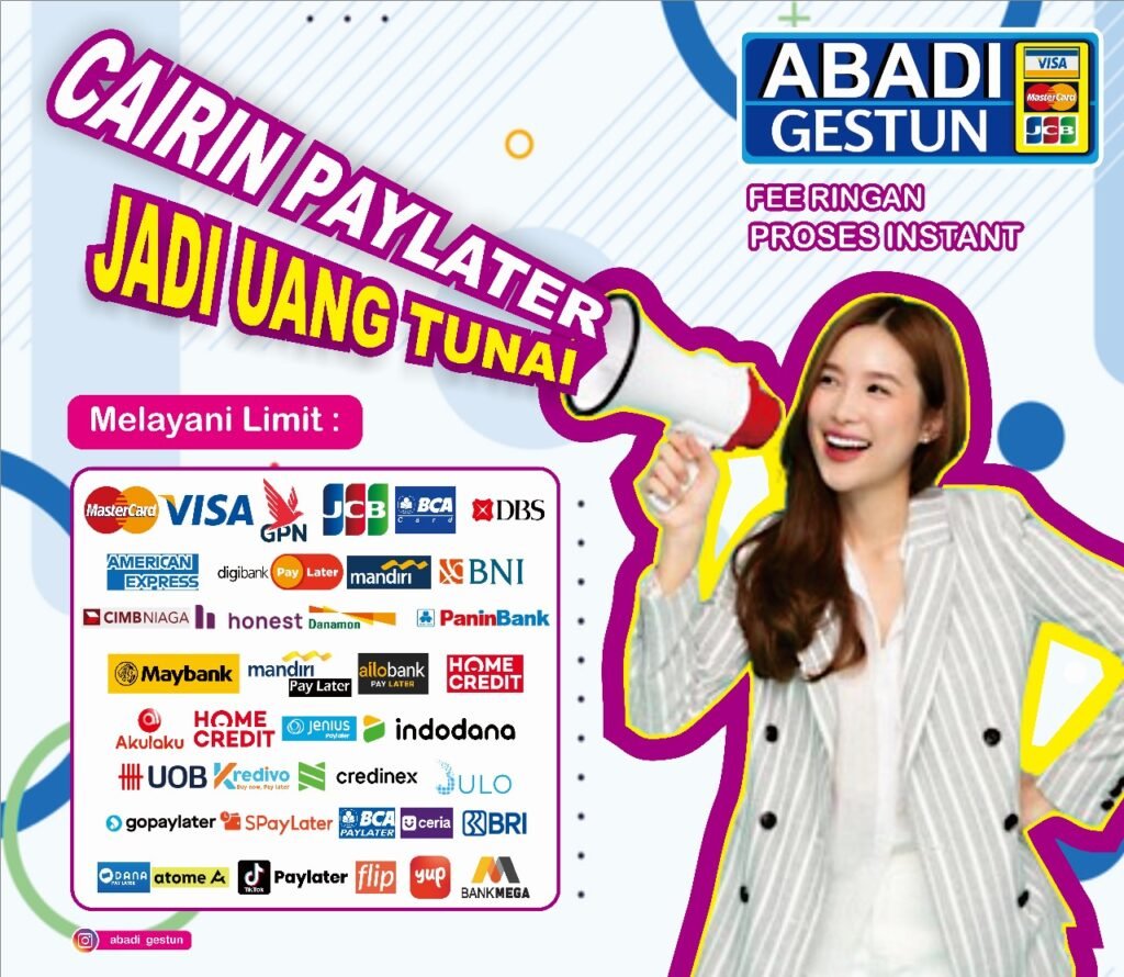 Abadi Gestun adalah Jasa Pencairan Limit Kartu kredit dan Paylater Terbesar dan Terlengkap Se-Indonesia. Abadi Gestun sudah terbukti aman, terpercaya, dan telah digunakan oleh ribuan nasabah di seluruh Indonesia. Abadi Gestun menyediakan proses cepat, transparan, dan yang pasti terjamin uang akan ditransfer.