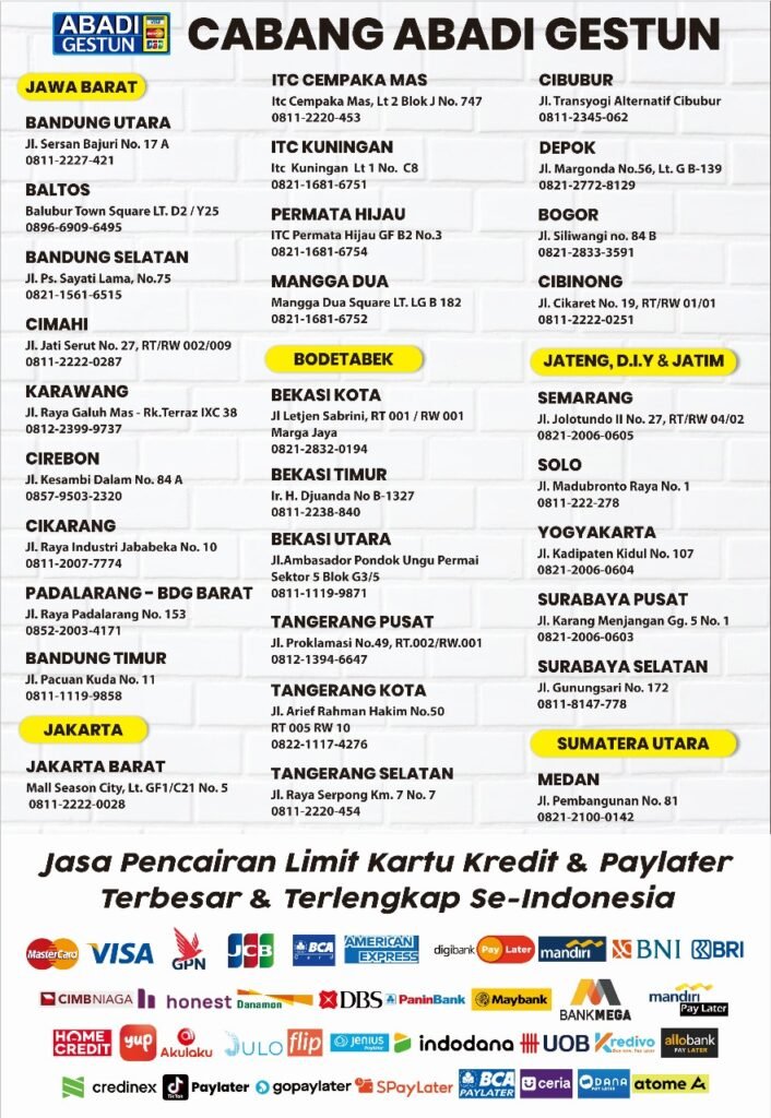 Abadi Gestun hadir sebagai layanan pencairan limit kartu kredit dan Paylater terbesar dan terlengkap di Indonesia. Dengan puluhan cabang resmi yang tersebar di berbagai kota, kami terus memperluas jangkauan agar semakin terjangkau oleh semua nasabah di Indonesia.